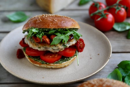 Italiensk inspireret kyllingeburger udviklet af Mia Emilie Se Mia Emilie Perssons opskrift på kyllingeburger med basilikum, parmesan og bagte tomater. En saftig lækkerbisken, hvor hakkebøffen er af kyllingekød. Læs nu